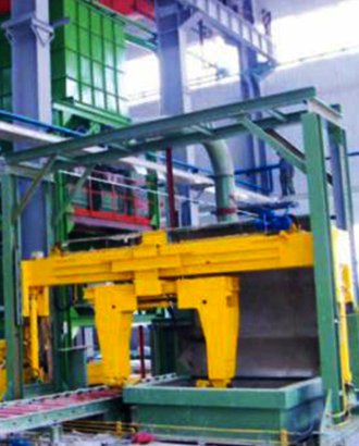 造型主機是采用氣流加砂頂射+底射系統(tǒng),型砂直接對著模具分別從上砂箱的上部和下砂箱的下部射砂,型砂填充在砂箱里